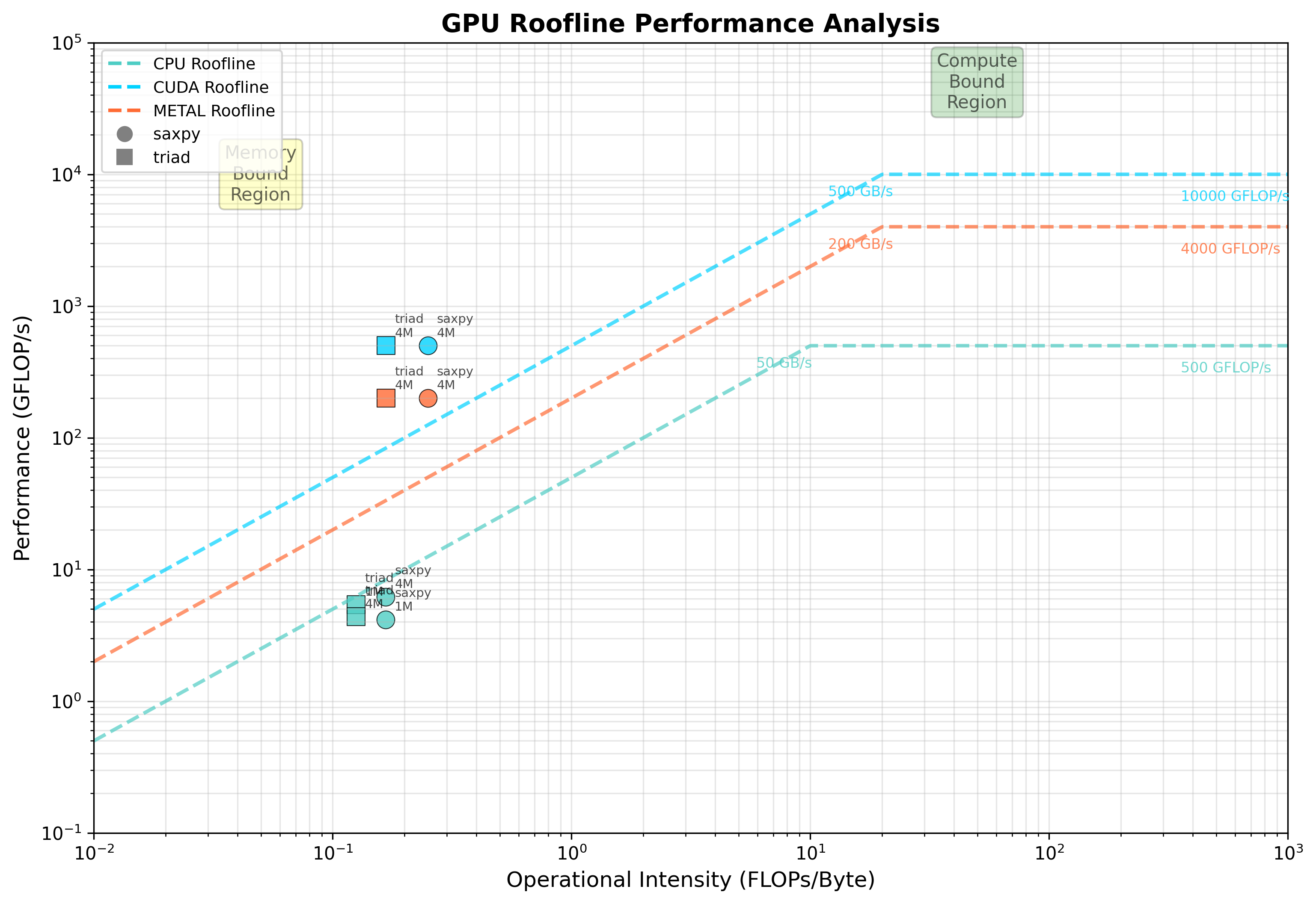 A cross-platform benchmarking tool to identify bandwidth vs. compute bottlenecks across diverse hardware (CPU, CUDA, Metal).