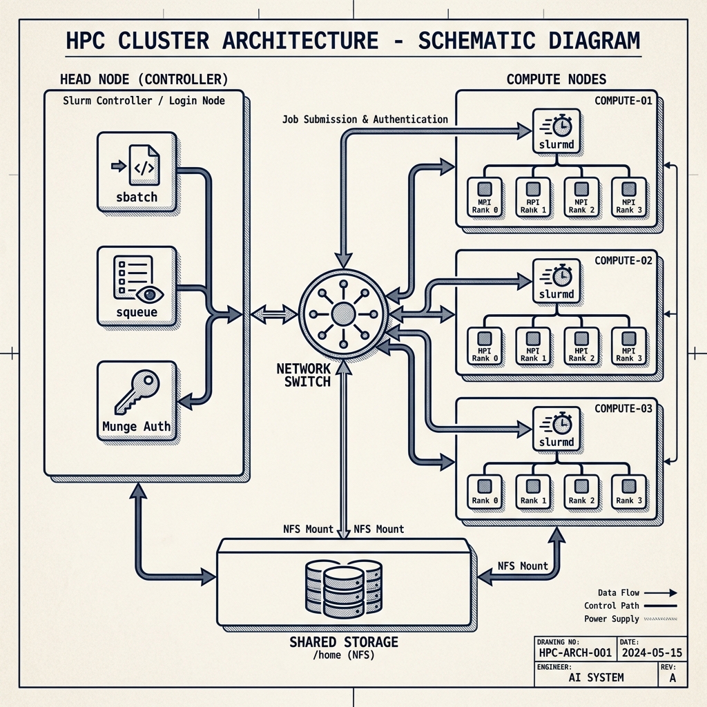 Local simulation of a multi-node HPC cluster for job scheduling and parallel workload validation.
